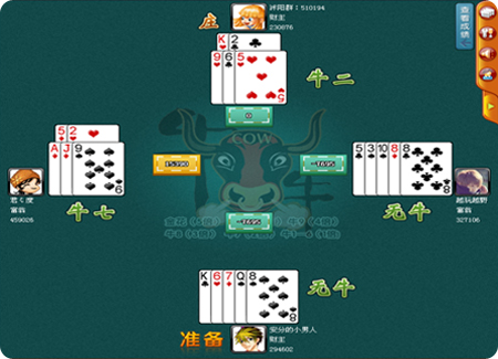 游戏为四个人玩,一方为庄家,另三方为闲家,开始后由闲家向桌面掷筹码,掷完筹码后系统开始发牌,最后比较大小,闲家的牌点数大于庄家则算胜利。先决条件是:牛牛大于任何牌点数,牛9(前三张的组合成整数称之为“牛”)大于牛8。有牛的牌大于无牛的牌,玩家手中任意的三张牌组合不成一个整数,则被称之为无牛牌,无牛牌的比较就按牌中最大的那张进行比较。