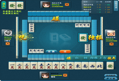 4. 大台 比如手里123条 789筒 567条 一对2万将 2个混 抓了一个2万 此时系统提示胡牌或上台,如果选择上台,系统自动打出去一个混[和自己打混出去,成为相公是不一样的啊]此时为上台,三家没有胡牌的,在到自己抓牌时候可以胡牌按照10分加2分=12分记分,如果在上台以后,有人胡牌,只能收取2分,上台最多可以上两次台