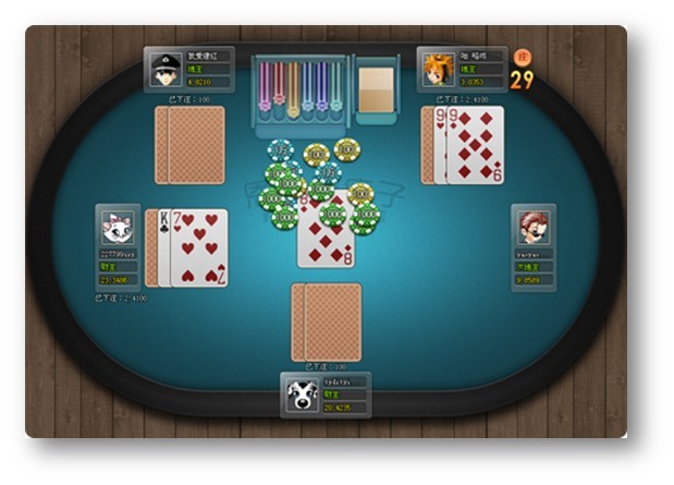 首先玩家全部下底注。以5为例。首先玩家全部下底注5。发第一张牌,然后发第二张牌。发第二张牌的时候玩家都可以看见自己的第一张底牌。第二张牌是明着的。